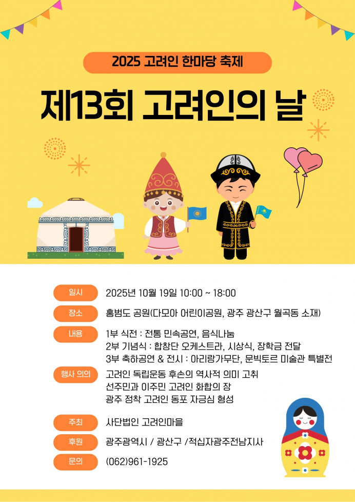 ¿ÃÇØ·Î 13ȸ¸¦ ¸ÂÀº ¡®°í·ÁÀÎÀÇ ³¯¡¯Àº 1937³â ½ºÅ»¸°ÀÇ °Á¦ÀÌÁÖ·Î Á߾Ӿƽþƿ¡ ³»¸ô·È´ø °í·ÁÀεéÀÇ ¿ª»ç¿Í Á¤Ã¼¼ºÀ» ±â¸®°í, ³¸¼± Á¶»óÀÇ ¶¥À» Èû°ã°Ô »ì¾Æ°¡´Â °í·ÁÀÎ ÈļյéÀÇ »îÀ» ÀÀ¿øÇϱâ À§ÇØ ¸Å³â °³Ãֵǰí ÀÖ´Ù.